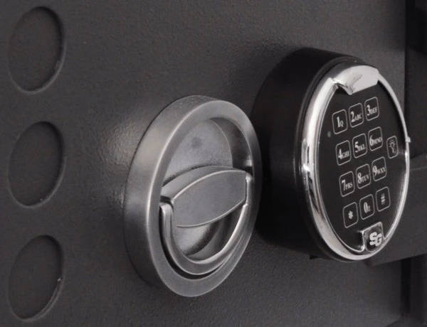 - На дверь установлен американский электронный замок Sargent&Greenleaf, обладающий сертификатами: VdS Class 2, UL Type 1, CEN B и т.д. Замок защищён от подбора кода и допускает до миллиона кодовых комбинаций.